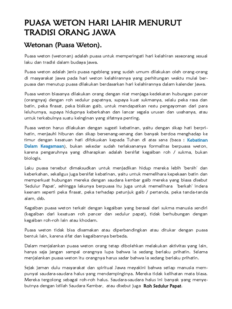 Adapun bacaan niat puasa weton yang biasa dilafazkan adalah sebagai berikut. Sebagai contoh mereka dapat merasakan atau mengetahui hal-hal gaib yang ada di sekitarnya. Melakukan sahur dan berbuka puasa.